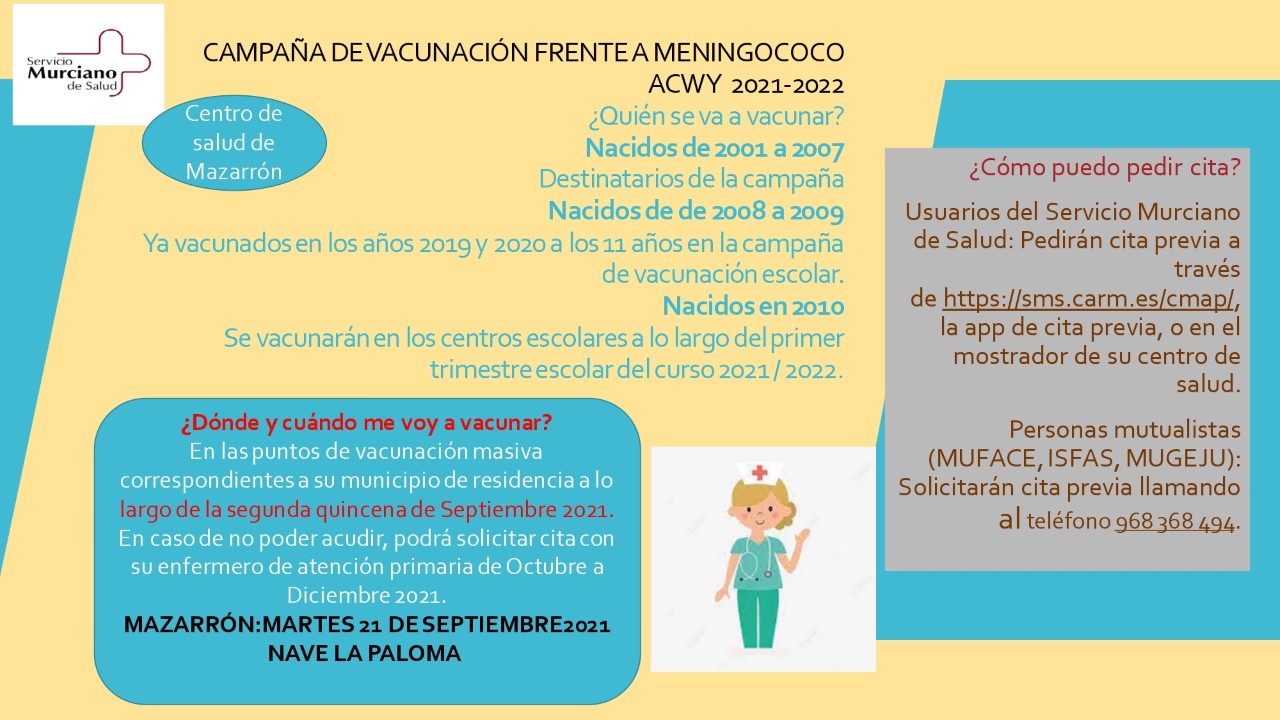 Para intentar disminuir el aumento de la meningitis se va a vacunar en el Municipio de Mazarrón a todos los nacidos a partir de 2001 el próximo martes 21 de septiembre en la nave del Grupo Hortofrutícola Paloma. Se debe coger cita en https://sms.carm.es/cmap/ también en la app de cita previa y en el mostrador del centro de salud.