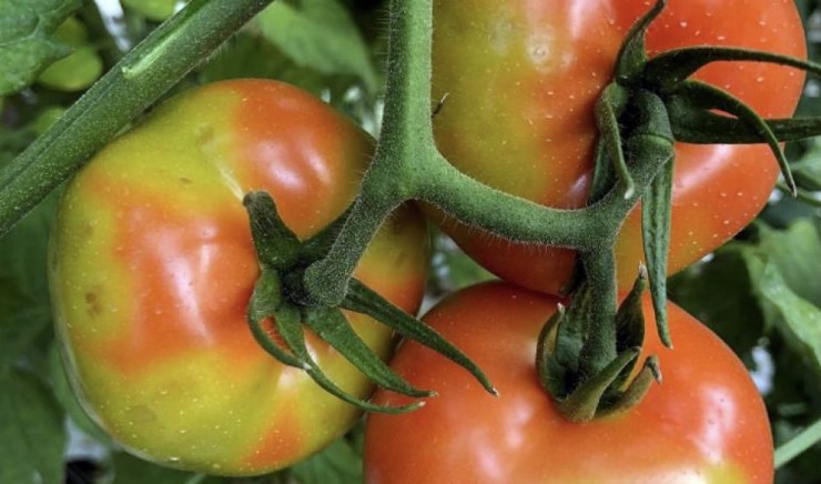 Posteriormente se produce una maduración irregular en frutos jóvenes (zonas verdes y rojas en el mismo fruto), para mostrar cuando están próximos a su recolección zonas con una coloración naranja que no viran a rojo. Pudiendo aparecer lesiones rugosas marrones (síntoma no habitual) y la reducción del número de frutos por rama.