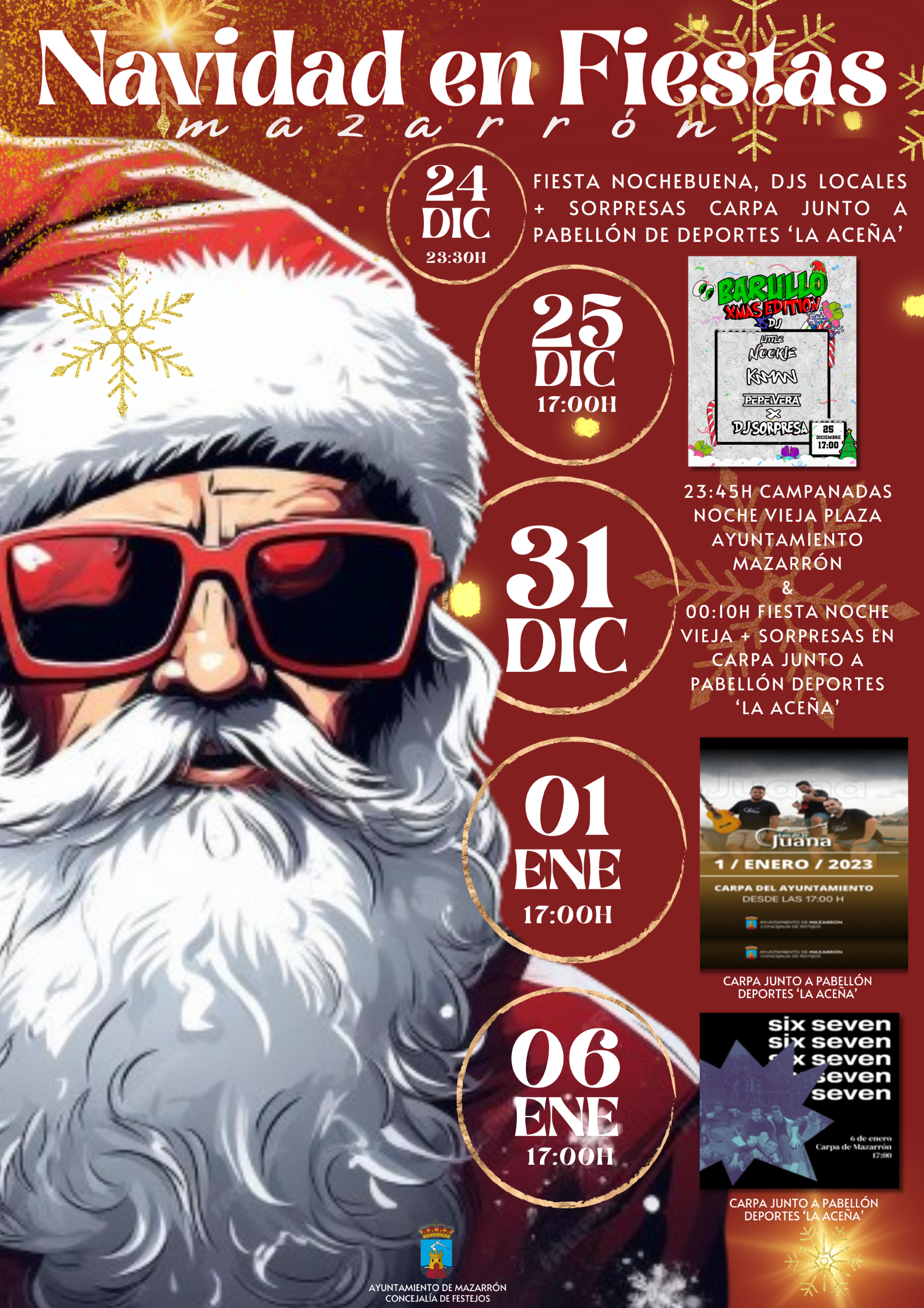 - 23:30 h. Fiesta Nochebuena, Dj’s locales + sorpresas. Lugar: Carpa junto al Pabellón de Deportes de La Aceña (Mazarrón)